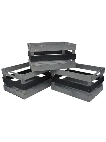 Holzkiste Vintage 3er Set 39x29x21 cm grau/schwarzDas stilvolle Design der Holzkisten bringt Vintage Flair in Ihr Zuhause und verschönert jeden Raum. Die Holzkisten sind vielseitig einsetzbar, egal ob als Dekoration, zur Aufbewahrung, zum Transportieren oder als kleines Möbelstück. Dekorieren Sie die Holzkiste mit weiteren Dekoelementen oder verwandeln Sie diese in ein praktisches Regal oder einen Beistelltisch. Sie sind auf der Suche nach einer kreativen Geschenkidee? Diese Weinkisten eignen sich nicht nur als Geschenk selbst, sondern auch als Geschenkkiste in dem Sie Kleinigkeiten schön präsentieren können. Überraschen Sie damit Ihre Freunde, Familie und Bekannte!ProduktdetailsMaterial: – Holz Details: – 3er Set Holzkisten Verwendung: – Dekokiste oder Aufbewahrungskiste Abmessungen: – Maße: 39 x 29 x 21 cm (LxBxH)