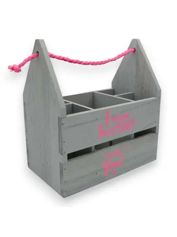Trendiger Flaschenhalter für Mädelsabende oder als Geschenkidee „I wanna have sekt with you“Unser Flaschenhalter ist in zwei kreativen Varianten erhältlich.Die graue Version mit pinker Schrift und einem auffälligen pinken Griff aus Jute verleiht ihm einen modernen Touch.Alternativ können Sie sich für die pinke Ausführung mit goldener Schrift und einem glamourösen goldenen Jute-Griff entscheiden.Die Griffe sind nicht nur farbenfroh, sondern auch strapazierfähig, um Ihnen ein komfortables Trageerlebnis zu bieten. Unser Flaschenhalter verfügt über vier separate Fächer, die jeweils Platz für eine Flasche bieten.Zusätzlich befindet sich in der Mitte ein geräumiges Fach, das genügend Platz für allerlei Snacks und Extras bietet. Mädelsabend: Dieser Flaschenhalter ist die perfekte Ergänzung für Mädelsausflüge, Junggesellinnenabschiede, Silvester, Karnevall, Festivalsoder entspannte Tage am Strand oder im Park und wird zum Highlight jeder geselligen, lustigen Runde.Geschenkidee: Nutzen Sie unseren Flaschenhalter als Geschenkeset oder Mitbringsel und überraschen Sie Ihre Freunde mit einer stilvollen Verpackung.Ob Sekt, Wein, Aperol, Prosecco, Bier, Radler oder Lillet – dieses Accessoire eignet sich hervorragend, um Ihre Lieblingsgetränke stilvoll zu präsentieren.Darüber hinaus bietet der Flaschenhalter genügend Platz für Snacks wie Chips, Schokolade, Popcorn oder Flips,um den Abend noch köstlicher zu gestalten.Egal, ob Sie ihn für sich selbst kaufen oder als Geschenk für Ihre besten Freundinnen –unser Flaschenhalter ist nicht nur praktisch, sondern auch ein echter Hingucker, der für viele fröhliche Stunden sorgt.Cheers!!Details:Abmessung: 27,5x16x29,5cm (LxBxH) Farben: grau, pink Material: Holz Griff: aus Jute