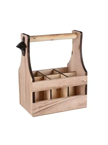 Rustikaler Holz-Flaschenhalter mit integriertem Flaschenöffner – Das ideale Geschenk für BierliebhaberSuchen Sie nach dem perfekten Geschenk für Männer zu besonderen Anlässen? Ihr Suchen hat ein Ende! Unser rustikaler Holz-Flaschenhalter vereint Funktionalität, Ästhetik und praktischen Nutzen auf beeindruckende Weise. Er bietet Platz für bis zu sechs Flaschen und verfügt über einen integrierten Flaschenöffner – ein absolutes Must-Have für Bierliebhaber und Genießer. Eigenschaften:Platz für 6 Flaschen: Mit ausreichend Raum für sechs Flaschen eignet sich dieser Halter perfekt für gesellige Runden, Grillabende oder entspannte Fahrradtouren mit Freunden und Familie. Integrierter Flaschenöffner: Nie wieder suchen Sie verzweifelt nach einem Flaschenöffner! Dieser Halter ist mit einem integrierten Flaschenöffner ausgestattet, der das Öffnen Ihrer Lieblingsgetränke zum Kinderspiel macht. Perfektes Geschenk: Ob zum Geburtstag, Vatertag oder einfach als Dankeschön – dieser Flaschenhalter ist ein Geschenk, das Männerherzen höher schlagen lässt. Zeigen Sie Ihre Wertschätzung auf stilvolle Weise und sorgen Sie für unvergessliche Momente. Geflämmtes Holz: Der rustikale Look wird durch die spezielle Flammbehandlung des Holzes erreicht, wodurch jedes Stück zu einem Unikat mit markanten Texturen und Farbnuancen wird. Vielseitige Verwendung: Nicht nur für Bierliebhaber – dieser Halter eignet sich auch hervorragend für die Aufbewahrung anderer Getränke wie Limonade, Wasser oder handgemachte Säfte. Produktdetails:Länge: ca. 25cm Breite: ca. 17 cm Höhe: ca. 32 cm Material: Holz Geeignet für: 6 Flaschen á 0,5 Liter Inklusive integriertem Flaschenöffner aus Metall Dekoration nicht im Lieferumfang enthalten!