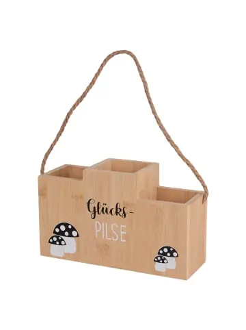 Origineller Flaschenhalter Glücks-Pilse – in Holz oder Bambus Mit diesem charmanten Flaschenhalter im Glücks-Pilse-Design bringen Sie Stil, Witz und Funktionalität auf den Tisch. Ob aus klassischem Holz oder modernem Bambus – beide Varianten überzeugen durch natürliche Optik und hochwertige Verarbeitung. Der Flaschenhalter bietet Platz für bis zu drei Flaschen und wird mit einer stabilen Kordel geliefert, die den Transport besonders einfach macht. Perfekt für gesellige Abende, Gartenpartys, Picknicks oder als originelle Geschenkidee für Bierliebhaber und Dekofans.Das verspielte Design mit dem humorvollen Schriftzug „Glücks-Pilse“ sorgt garantiert für ein Lächeln bei Ihren Gästen. Ganz gleich, ob als Deko-Highlight in der Küche oder als praktisches Accessoire beim nächsten Ausflug – dieser Flaschenhalter ist ein echter Hingucker. Produktdetails:Material: Wahlweise aus Holz oder Bambus Maße: 16 x 26,5 x 9,5 cm (HxBxT) Maße Flaschenhalteröffnung: 7,5 x 7,5 cm Mit praktischer Tragekordel Witziges Design mit „Glücks-Pilse“-Schriftzug Perfekt als Geschenk oder dekoratives Element