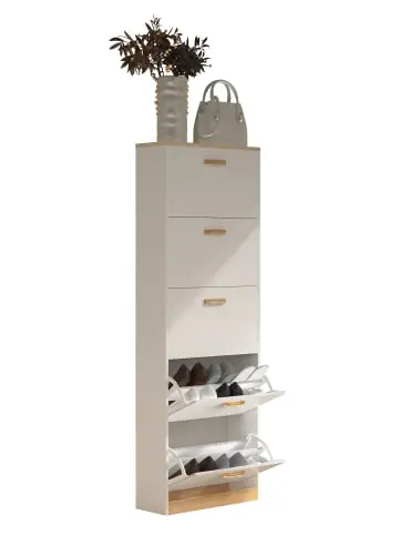 Highlight – Maße ca. H. 170 x B. 59 x T. 22 cm – 5 Fächer zum Aufklappen – Für ca. 30 Paar Schuhe Der Schuhschrank „Halom“ ist ein kleines Raumwunder mit viel Stauraum. Jedes der fünf Fächer hat eine Fachunterteilung, damit Sie die Schuhe platzsparend und übersichtlich verstaut werden können. Ein besonderes Highlight ist dem Designer mit dem Farbakzenten gelungen, womit sich die Griffe elegant absetzen und den Schuhschrank zu einem zeitlosen Blickfang machen. Der Schuhkipper kann mit weiteren Schuhregalen der Serie „VCM Halom“ kombiniert werden.VCM hat sich seit den 70er-Jahren auf die Konstruktion, Produktion und Vertrieb von Möbeln mit einem fairen Preis/Leistungsverhältnis spezialisiert und damit bereits Millionen Haushalte verschönert.- Schuhschrank für ca. 30 Paar Schuhe- Schuhregal mit praktischen 5 Klappen- Schuhkipper ca. H. 170 x B. 59 x T. 22 cm