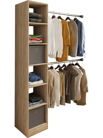 Highlights: – Beschläge aus hochwertigem Metall – Sechs offene Fächer sorgen für ausreichend Stauraum – Alle Fächer haben eine Höhe von jeweils ca. 30 cm- Zwei Kleiderstangen, jeweils in der Länge variabel ausziehbar von ca. 80-150 cm- Maße Möbel ca. B. 38 x H. 194 x T. 40 cmDas Regal ist ein absolutes Raumwunder für die Ordnung, welches zusätzlich eine schöne Übersicht aller Kleidungsstücke bietet. Im Lieferumfang enthalten sind zwei variable Kleiderstangen, welche sich in der Länge von 80 – 150 cm dem Platzbedarf anpassen. Mit der Dacho-Serie können Sie problemlos einen begehbaren Kleiderschrank gestalten.VCM hat sich seit den 70er-Jahren auf die Konstruktion, Produktion und Vertrieb von Möbeln mit einem fairen Preis/Leistungsverhältnis spezialisiert und damit bereits Millionen Haushalte verschönert.- Offener Kleiderschrank erweiterbar- Begehbares Regal mit 6 Fächern, jeweils 30 cm hoch- Kleiderstangen variabel ausziehbar ca. 80-150 cm- Maße Schrank ca. B. 38 x H. 194 x T. 40 cm- Das Regal ist ein absolutes Raumwunder für die Ordnung, welches zusätzlich eine schöne Übersicht aller Kleidungsstücke bietet
