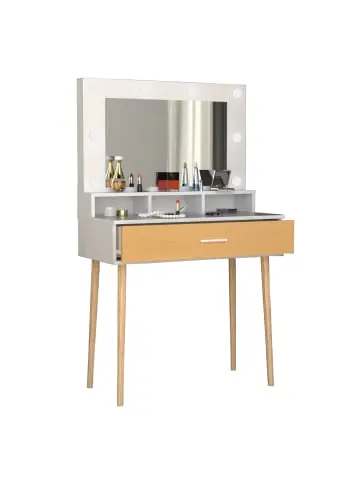 Highlights: – Eine Schublade mit edlem Metallgriff- Drei offene Fächer sorgen für ausreichend Stauraum- Gute und stabile Verarbeitung – Holzstruktur-Nachbildung – Schmink- oder Schreibtischfläche ca. B. 80 cm x T. 24 cm- Maße Schminktisch ca. H. 133 x B. 80 x T. 40 cm – Dieses Produkt enthält eine Lichtquelle der Energieeffizienzklasse DIm skandinavischen Design bietet der Schminktisch „Lindas“ mit drei offenen Fächern und einer großzügigen Schublade genug Platz für ihre Kosmetika. Durch die 8 Glühbirnen haben sie stehts genug Licht. Durch sein simples und schickem Design wertet er jedes Schlaf- oder Anrichtezimmer auf.Passend dazu empfehlen wir den Hocker „Lindas“.VCM hat sich seit den 70er-Jahren auf die Konstruktion, Produktion und Vertrieb von Möbeln mit einem fairen Preis/Leistungsverhältnis spezialisiert und damit bereits Millionen Haushalte verschönert.- Kosmetiktisch mit 3 offenen Fächern und Schublade- Frisiertisch mit Hocker, Spiegel und heller Beleuchtung- Schminktisch – Fläche B. 53 cm x T. 43 cm- Maße Schminktisch ca. H. 133 x B. 80 x T. 40 cm