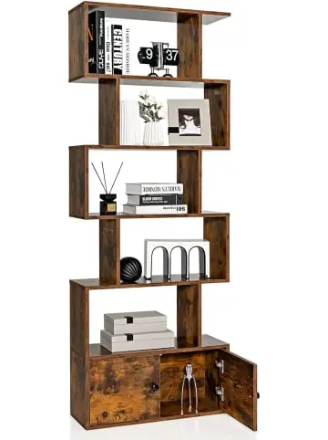 Beschreibung: Mit seinem geometrischen Design ist unser S-förmiges Bücherregal mit Schrank eine großartige Ergänzung für Ihren Raum, geeignet für Wohnzimmer, Schlafzimmer und Heimbüro. 5 offene Regale und ein geschlossener Schrank bieten viel Stauraum für Ihre Haushaltsgegenstände, Dekorationen, Bücher, Pflanzen und mehr. Der zweitürige Schrank ist mit Türgriffen und hochwertigen Scharnieren ausgestattet und sorgt für ein sanftes Öffnen und Schließen der Türen für eine lange Nutzungsdauer. Die Unterseite hat rutschfeste Fußpolster, die den Boden auch vor Kratzern schützen können, wenn Sie das Bücherregal bewegen. Aus Sicherheitsgründen wird dieses freistehende Lagerregal mit 4 Kippsicherungen geliefert, um es an der Wand zu befestigen.Eigenschaften: Entworfen im S-förmigen geometrischen Stil, um eine großartige Dekoration in Ihrem Raum zu sein Viel Stauraum mit 5-stufigem offenem Regal und einem geschlossenen Schrank Wasserdichte Oberfläche macht die Reinigung mühelos Ausgestattet mit Kippschutzvorrichtungen für zusätzliche Sicherheit Rutschfeste Fußpolster schützen Ihren Boden außerdem vor Kratzern Geeignet für verschiedene Orte wie Schlafzimmer, Wohnzimmer und Heimbüro Material: Holzwerkstoff + MDF Gesamtmaße: 70 x 23 x 183 cm (L x B x H) Tragfähigkeit jedes Regals: 20 kg Nettogewicht: 24,5 kgLieferungsumfang: 1 x Bücherregal mit Türen 1 x Anleitung