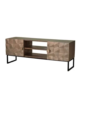 TV-Möbel aus Mangoholz, Details in Bronze. Artikelmaße: 55 cm Höhe – 140 cm Länge – 140 cm Tiefe. Artikelgewicht: 42KG. Wood