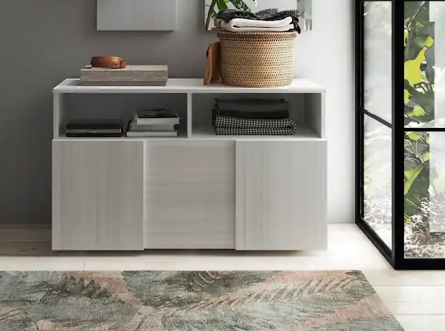 Die Garderobenbank B/T/H 91/35/51 cm in einem extravaganten Design setzt einen eleganten Akzent in jedes Zuhause.. Die grifflose 3D-Optik wertet Ihren Flur oder Diele optisch auf. Für mehr Stabilität sorgen die Beschläge aus Metall.. Stauraum für Schuhe (ca. 4 Paar), Schals, Mützen oder andere Utensilien ist vorhanden, 1 Klappe dahinter 2 Fächer, darüber 2 offene Fächer.. Langlebig und pflegeleicht ist die melaminbeschichtete Oberfläche.. Die Herstellung erfolgt aus FSC®-zertifiziertem Holzwerkstoff. Die max. Belastbarkeit des Oberbodens/Top ist auf 40 kg festgelegt.