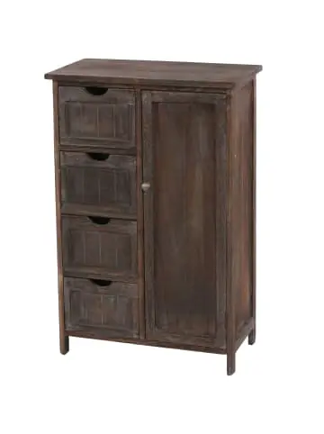 – Markeninhaber TÜV-Süd QM zertifiziert mit Nr. 12 100 59626 TMS für Qualitäts-Management in Deutschland – Lieferumfang: 1x Kommode, ohne Dekoration – Aus massivem Paulowniaholz – Tür mit Ablagefach – 4 Schubladen – Modernes DesignGesamtmaße (ca.):Höhe: 82 cmBreite: 55 cmTiefe: 30 cm Innenmaße einer Schublade (ca.):Höhe: 14,5 cmBreite: 20,5 cmTiefe: 22,5 cm Innenmaße Ablagefach (ca.):Höhe: 35 cmBreite: 24 cmTiefe: 23 cm Holzstärke der Fronten (ca.): 1,5 cm Hübsch hässlich, schick schäbig, Trash ist das neue Neu – und vor allem der allerletzte Schrei! Wir präsentieren: den Shabby-Look. Lassen Sie sich von der lädiert anmutenden Oberfläche nicht täuschen, die Produkte dieser Serie sind qualitativ hochwertig verarbeitet und wurden nur aus den besten Materialien gefertigt. Die Holzelemente wurden hauptsächlich aus der Paulownie hergestellt, einem auch schon in Europa kultivierten Wertholzbaum, der aufgrund seiner Leichtigkeit und hohen Stabilität auch als das Aluminium der Hölzer bezeichnet wird. Die gebürstete Oberfläche verleiht jedem einzelnen unserer Shabby-Produkte einen ganz eigenen, individuellen Used-Look, der einerseits rustikal, andererseits aber auch spielerisch leicht wirkt und sich somit nahtlos in jede Umgebung einfügt, es aber auch schafft Akzente zu setzen. Ihrer Kreativität sind hier keinerlei Grenzen gesetzt. Die universelle Möbelserie im Vintage-Look.Versandzustand: Zerlegt–Sicherheitshinweise für Teilartikel mit Artikelnummer 35433 Dieser Artikel ist ein Schrank und sollte nur als solcher benutzt werden. Der Artikel ist nur für den Innenbereich geeignet. Überladen Sie den Artikel nicht. Vorsicht: Verletzungsgefahr! Setzen, stellen oder stützen Sie sich nicht auf den Artikel.Vorsicht Erstickungsgefahr! Verpackungsmaterial, wie Plastikbeutel, gehören nicht in Kinderhände. Bitte von Babys und Kleinkindern fernhalten! Nicht über den Kopf ziehen! Vorsicht: Verschluckungsgefahr! Achtung dieser Artikel kann verschluckbare Kleinteile enthalten! Halten Sie die Kleinteile von Kindern fern! Prüfen Sie den Artikel regelmäßig alle 3-6 Monate auf Beschädigungen und gelöste Verbindungen. Ziehen Sie lose Schrauben wieder fest an! Sollten Beschädigungen entdeckt werden, darf der Artikel nicht mehr genutzt werden! Warnung: Kippgefahr, Unfallgefahr und Verletzungsgefahr!Ein Möbelstück, das nicht an der Wand befestigt wird, kann wenn es umfällt ein Kind oder einen Erwachsenen schwerwiegend oder sogar tödlich verletzen. Befestigen Sie daher alle Möbel mit Winkeln oder speziellen Kippschutzen (teilweise nicht im Lieferumfang enthalten) an der Wand. Achten Sie dabei immer auf mögliche Kabel oder Rohre die in der Wand verlegt sein können.Benutzen Sie diesen Artikel nur für die bestimmungsgemäße Verwendung, im technisch einwandfreien Zustand und für private Zwecke. Andere Verwendungen gelten als nicht bestimmungsgemäß und können zu schweren Verletzungen und Beschädigungen führen. Für aus bestimmungswidriger Verwendung entstandene Schäden übernimmt der Hersteller keine Haftung.Allgemeine Hinweise: Bitte lesen Sie alle Hinweise sorgfältig durch, bevor Sie den Artikel aufbauen und verwenden. Verwahren Sie die alle Sicherheitsinformationen und Aufbauanleitungen gut auf. Für Ihre eigene Sicherheit und die Ihres Produktes, befolgen Sie bitte die Sicherheitshinweise. Eine falsche Handhabung könnte zu ernsten Verletzungen, beschädigtem Eigentum oder sogar dem Tod hinauslaufen.Pflegehinweise: Verwenden Sie eine weiche Bürste um losen Schmutz zu entfernen. Benutzen Sie niemals Waschmittel oder andere Putzmittel, um den Bezug zu reinigen. Entsorgungshinweise: Entsorgen Sie den Artikel umweltgerecht. Überlegen Sie Alternativen zu Entsorgung wie Spenden oder Verkaufen. Elektrische Artikel gehören nicht in den Hausmüll. Entsorgen Sie diese an einem Recyclinghof für elektrische und elektronische Altgeräte, weitere Informationen erhalten Sie bei Ihrer örtlichen Gemeindeverwaltung. Einlagerungshinweise: Der Artikel sollte trocken und sauber sein, verwahren Sie diesen geschützt in dem Karton in dem er geliefert wurde.