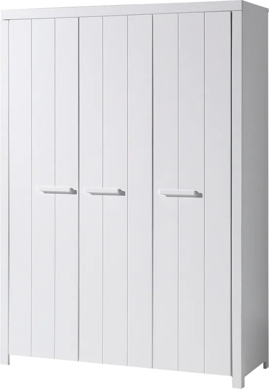 Geräumiger Kleiderschrank mit 3 Türen, passend zum Programm Erik. Der Korpus ist aus hochwertigem MDF, weiß lackiert. Der Korpus ist in Rahmenoptik gearbeitet, was die klassische LInie unterstreicht und womit der Landhaus-Charakter vermittelt wird. Die Türen haben eine geplankte Optik. Die Griffe auf den Türen sind sehr prägnant. Innen links hat der Kleiderschrank oben einen festen Boden (Fachmaß ca: B: 88,6 x H: 43 x T: 45 cm), darunter eine Kleiderstange. Unten ist zuätzlich ein verstellbarer Ablageboden (Fachmaß ca: B: 88,6 x H: 40 x T: 45 cm). Auf der rechten Seite befinden sich 5 geräumige Wäschefächer, 3 davon mit verstellbarem Boden (Fachmaß ca.: B: 43,9 x T: 45 cm). Die Deko gehört nicht zum Lieferumfang. Die Beschläge sind aus Metall. Die Ware ist zerlegt, mit Aufbauanleitung zur einfachen Selbstmontage. Benötigte Stellfläche ca.: B: 144 H: 206 T: 58 cm.