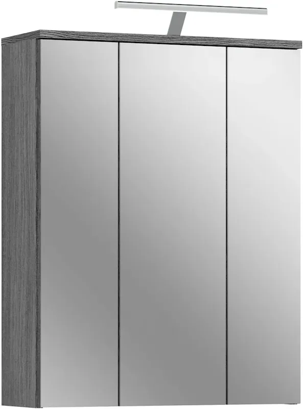 Maße ca. (B/T/H): 60/21/77 cm. 3 Spiegeltüren, 9 geschlossene Fächer, 6 höhenverstellbare Einlegeböden, Türanschlag der mittigen Tür wechselbar. inkl. LED Bad Aufsatzleuchte mit Steckerbox und Handschalter zum Direktnetzanschluss. Ideal geeignet für das Badezimmer als funktionales Möbelstück zur Aufbewahrung von Badartikeln und zur Ergänzung der Badezimmereinrichtung.. Das Möbel besteht aus FSC®-zertifiziertem Holzwerkstoff zum Schutz der Wälder