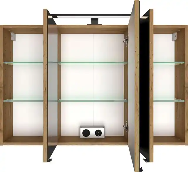 Gedämpfte Schraniere. Bei der mittleren Tür ist der Türanschlag wechselbar. Inklusive LED-Aufbauleuchte. Made in Germany. Maße (B/H/T): 100/64/20 cm