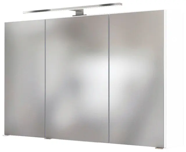 Sparsame LED-Beleuchtung inklusive. Gedämpfte Scharniere. 3D-Spiegeleffekt. Viel Stauraum. Bei der mittleren Tür ist der Türanschlag wechselbar