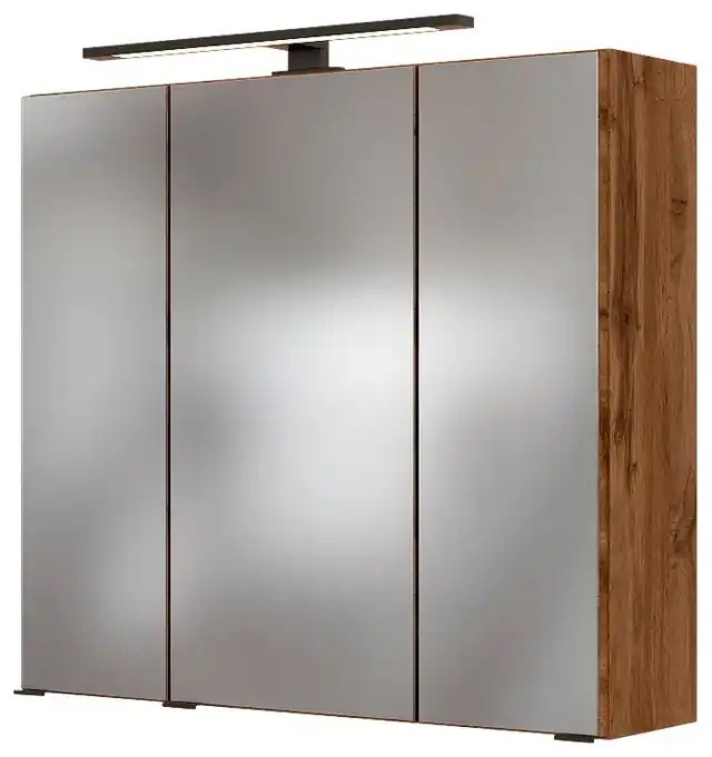 3D-Effekt, dank drei Spiegeltüren. Inklusive schwarzer LED-Aufbauleuchten. Verstellbare Glasböden. Steckdose frei positionierbar