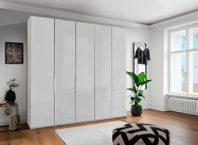 Moderne Glasfronten aus 3mm Floatglas sind unempfindlich gegenüber Kratzern. Individuell höhenverstellbare Schrankinneneinteilung. Die praktischen Falttüren ermöglichen einen Panoramablick über den Schrankinnenraum. Die hochwertigen Beschläge aus Metall sind besonders langlebig und hoch belastbar. Erstklassige Qualität „Made in Germany“