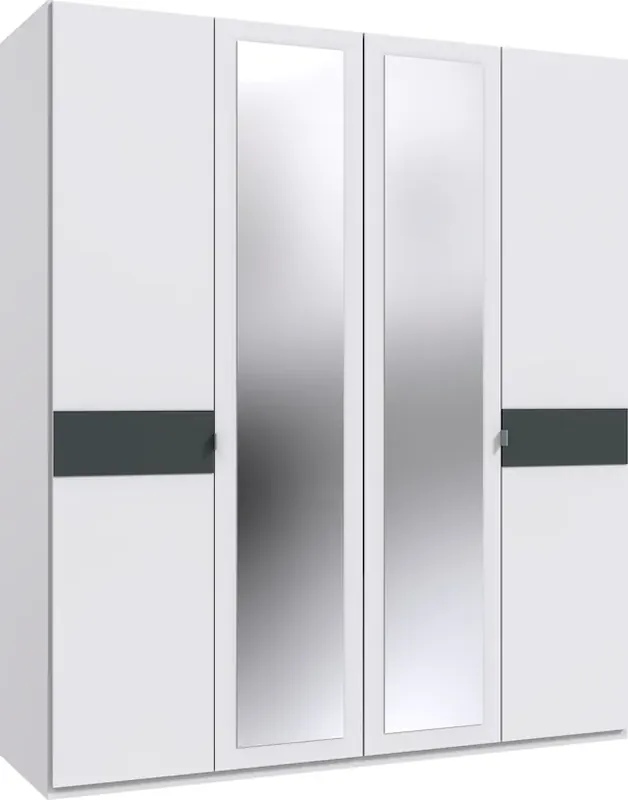 Kleiderschrank mit farblich abgesetzter Bauchbinde. Mit Spiegel. Metallbeschläge. Innendekor Line grey. Made in Germany