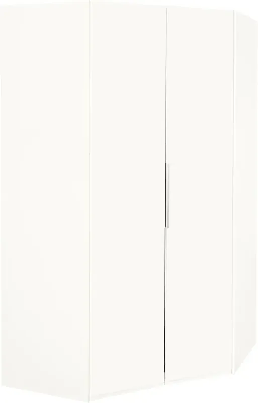 Moderner Eckschrank. Chromfarbene, eloxierte Metallgriffleisten. Schenkelmaße: 120/120 cm. Höhe: 216 cm oder 236 cm