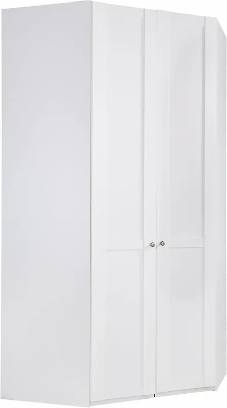 Praktische Ecklösung. 208 oder 236cm hoch. Schenkelmaße: 120/120 cm. Runde Metallgriffe. Mit dekorativen Aufleistungen