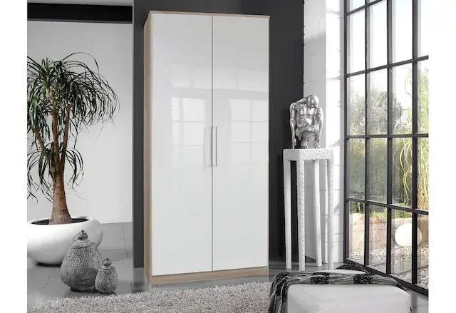 Modernes Schranksystem. Fronttüren in Hochglanz. In 3 Breiten. Beschläge und Kleiderstangen aus Metall