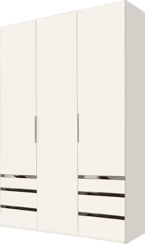 Unter den Außentüren jeweils 3 Schubkästen. Sockelhöhenverstellung zum Ausgleich von Fußbodenunebenheiten bis zu 15mm. Chromfarbene Metallgriffleisten. 6 Schubladen mit Selbsteinzugs-Funktion