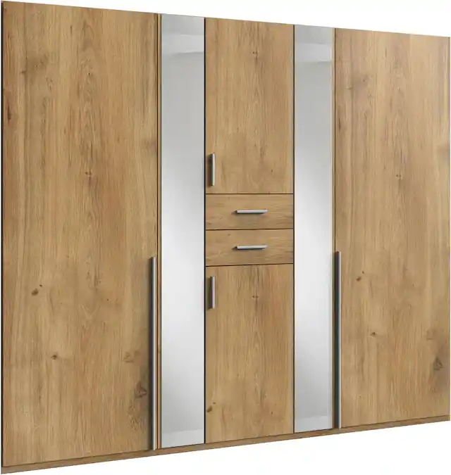Dieser Kleiderschrank mit schmalen Spiegelelementen schafft auf schicke Weise Platz in jedem Zuhause. Hinter den Schranktüren findet sich ausreichend Stauraum für verschiedenste Kleidungsstücke. Jacken und Pullover sowie Kleider und Blusen können hier ordentlich verstaut werden. Kleinere Dinge können in praktischen Schubkästen verwahrt werden, die durch die mittige Position auf bequemer Griffhöhe liegen. Das schicke Schlafzimmermöbel ist zu verschiedenen Einrichtungen kombinierbar.