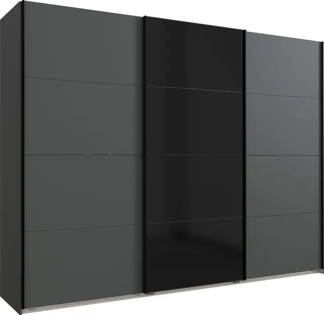 Moderner Schwebetürenschrank mit Glaselementen. Griffleisten aus Metall. Innendekor Leinen grau. Metallbeschläge. Made in Germany
