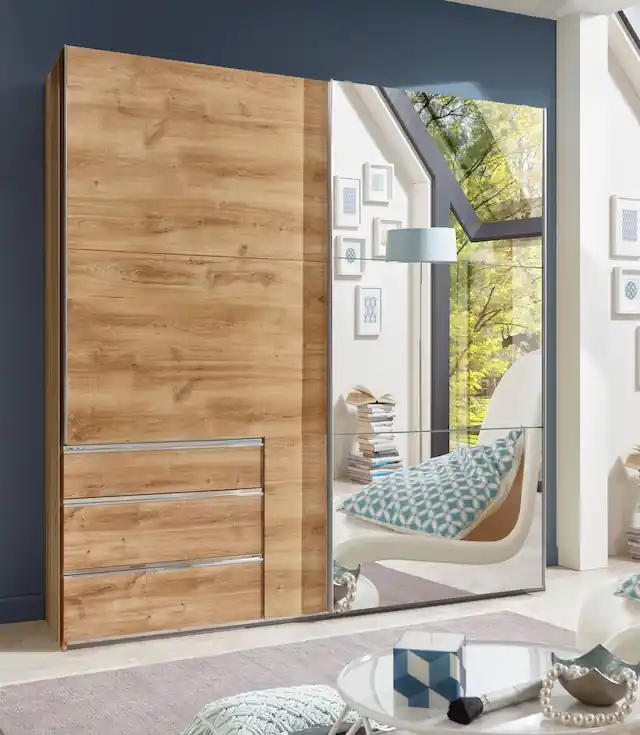 Der Fresh To Go Schwebetürenschrank mit Schubkästen punktet mit seinem modernen Design und funktionalen Merkmalen. Er bietet mit zahlreichen geräumigen Ablagefächern, Schubladen und Kleiderstangen viel Platz für Kleidung, Accessoires, Unterwäsche und andere Dinge. Durch die große Spiegeltür verschönert er das gegebene Ambiente. Gefertigt ist der Kleiderschrank in solider Qualität mit pflegeleichten Oberflächen. Die Passepartoutleisten können separat dazu bestellt werden. Für den festen Stand auf jedem Untergrund ist dieses Schlafzimmermöbel mit einer Sockelhöhenverstellung ausgestattet.