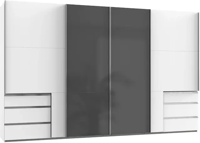 Der Fresh To Go Schwebetürenschrank mit Schubkästen punktet mit seinem modernen Design und funktionalen Merkmalen. Er bietet mit zahlreichen geräumigen Ablagefächern, Schubladen und Kleiderstangen viel Platz für Kleidung, Accessoires, Unterwäsche und andere Dinge. Durch die große Spiegeltür verschönert er das gegebene Ambiente. Gefertigt ist der Kleiderschrank in solider Qualität mit pflegeleichten Oberflächen. Die Passepartoutleisten können separat dazu bestellt werden.