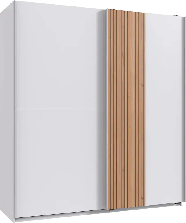 Moderner Schwebetürenschrank mit Akustiklamellen Optik. Farblich abgestimmte Griffleisten. Beschläge, Kleiderstangen aus Metall. Innendekor Line grey. Made in Germany