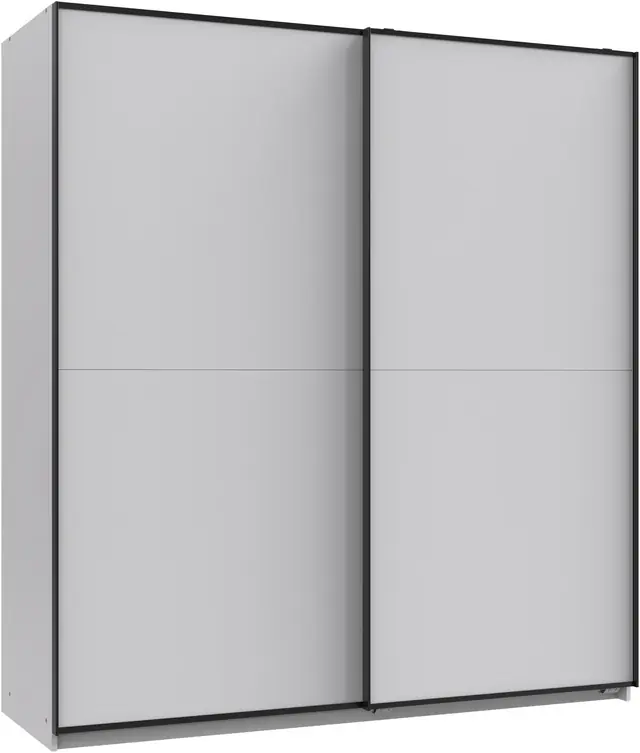 Schlichter Schrank mit attraktiven schwarzen Griffleisten: Bietet ein modernes Design und setzt stilvolle Akzente in jedem Schlafzimmer.. Griffleisten und Beschläge aus Metall: Bieten nicht nur eine hochwertige Optik, sondern sorgen auch für Langlebigkeit und eine einfache Handhabung.. Innendekor Line grey: Sorgt für eine elegante und dezente Innengestaltung, die das Gesamtbild harmonisch abrundet und für Stil sorgt.. Leichtgehende Schwebetüren: Ermöglichen ein sanftes Öffnen und Schließen, sparen Platz im Raum und bieten einen bequemen Zugriff.. Made in Germany: Garantiert hohe Qualität und sorgfältige Verarbeitung, für langlebige Möbel, die zuverlässig sind.