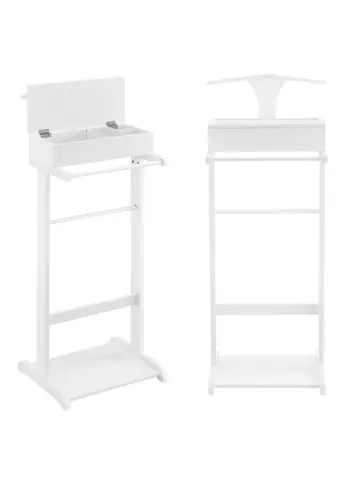 Stummer Diener Der stilvolle Kleiderständer verfügt neben einem Kleiderbügel und einem Hosenhalter auch über ein praktisches Aufbewahrungsfach für bspw. Uhren, Armbänder oder Manschettenknöpfe. Produktdetails: – Gestell für Anzüge, Mäntel, Jacken, usw. – Mit Kleiderbügel und Hosenhalter – Untere Ablage für Schuhe – Aufklappbares Staufach mit 4 Fächern – Pflegeleicht Maße (LxBxH): 43,5 x 34,5 x 110 cm Material: MDF + Kiefernholz Farbe: Weiß Lieferumfang: 1 x Herrendiener Markenware aus dem Hause: [en.casa]®