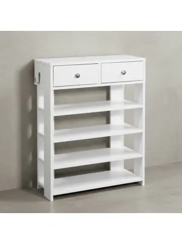 DesignModernes Schuhregal mit zwei SchubladenFlurregal mit vier geräumigen FächernSchlichtes Standregal im modernen LookAbmessungenBreite: 60 cmHöhe: 79 cmTiefe: 24 cmInnenmaß Schubladen (BxHxT): 22,5 x 8,5 x 18,5 cmInnenmaß der Regale (BxHxT): 57 x 15,5 x 22,5 cmMaximale Belastbarkeit: 5 kgFarbeWeißBesonderheitenViel Platz für 8 – 12 Paar Schuhe in unterschiedlichsten FormenSchubladen bieten Stauraum für Schlüssel, Sonnenbrille & Co.Haken zum Aufhängen von Taschen oder Schirmen ist individuell an der Seite montierbarBestens geeignet für Flure mit wenig PlatzDurch das Melaminharz sind die Oberflächen vor Kratzern geschütztZudem ist die Beschichtung wasserabweisendMaterialKorpus: SpanplatteHaken und Griffe: MetallLieferumfangEin Schuhregal ohne DekorationMontagematerial und Anleitung liegen der Lieferung beiMontageDer Aufbau ist, durch die gut durchdachte Konstruktion, im Handumdrehen erledigtPflegehinweiseDie Oberflächen am besten mit einem lauwarmen, leicht angefeuchteten Baumwolltuch abwischen und Restfeuchtigkeit mit einem fusselfreien Lappen entfernen. Scheuermittel und scharfe Reiniger unbedingt vermeiden.