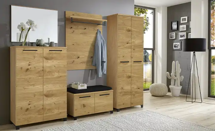 Mit dem Dielenschrank Valeo von Wohnwert lässt sich auf dem Flur ganz leicht Ordnung schaffen. Im Schrank können Schuhe, Mützen und Schals, aber auch Jacken und Mäntel untergebracht werden. Beide Türen schließen dank des integrierten Dämpfers langsam und geräuscharm. Valeo verfügt über eine hervorragende Qualität Made in Germany. Der Korpus ist mit Eiche Bianco furniert, die Front mit Balkeneiche.