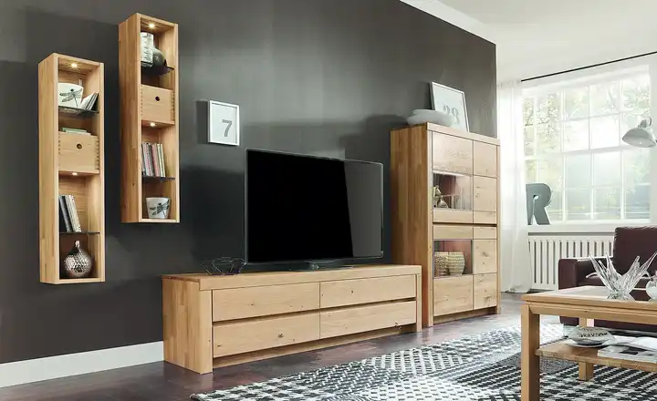 Die hochwertige Wohnwand Soleo 3000 ist aus gebürstetem Wildeichen-Holz hergestellt. Das hochwertige Naturmaterial ist robust und hat eine besonders schöne Holzmaserung, die der Wohnwand eine schöne natürliche Optik verleiht. Die Wohnwand besteht aus einer Standvitrine mit Glasteilen, einem TV-Board und 2 Regalen – so finden alle Dinge in Ihrem Wohnzimmer einen geeigneten Platz.