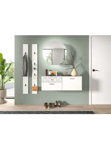 Verleihen Sie Ihrem Flur, Ihrer Diele oder Ihrem Hauswirtschaftsraum einen Hauch von Eleganz mit der 4-teiligen Garderobenkombination (B/H/T 172x192x34 cm) in Weiß Nachbildung mit Hochglanz-Absetzungen. Dieses vielseitige Möbelstück vereint praktische Funktionalität mit einem zeitlosen Design.Highlights im Überblick Elegante Rillenoptik: Die hochwertige Verarbeitung verleiht dem Möbelstück ein edles Erscheinungsbild, das sich perfekt in moderne Einrichtungskonzepte einfügt. 4-teiliges Set: Die Kombination bietet vielseitige Stauraummöglichkeiten, um Ordnung und Stil in Ihren Eingangsbereich oder Haushaltsraum zu bringen. Kompakte Maße: Mit B/H/T 172x192x34 cm passt diese Garderobenkombination ideal auch in kleinere Räume. Hochwertige Qualität und Pflegeleichtigkeit Gefertigt aus langlebigen Materialien, überzeugt das Möbelstück durch seine Robustheit und einfache Reinigung. Die sorgfältig gearbeiteten Oberflächen sind sowohl optisch ansprechend als auch funktional.Nachhaltig und umweltfreundlich Die Verwendung von FSC®-zertifiziertem Holzwerkstoff garantiert einen bewussten Umgang mit Ressourcen und unterstreicht den Wert von Qualität und Umweltverantwortung.Perfekte Lösung für Ihren Eingangsbereich Ob in Flur, Diele oder Hauswirtschaftsraum – die Garderobenkombination ist ein vielseitig einsetzbares Möbelstück, das Ihre Räume aufwertet. Die Kombination aus praktischem Stauraum und stilvollem Design macht dieses Möbelstück zur idealen Wahl für ein aufgeräumtes und elegantes Zuhause.