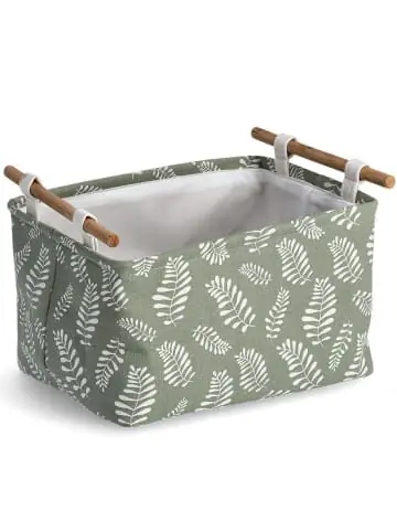 Ein offener Container zur Raumorganisation — eine stilvolle Ergänzung der Wohnungseinrichtung, die für Ordnung und Ordnung sorgtZur Aufbewahrung: Mit einem funktionalen Organizer können Sie alle kleinen Gegenstände in Ihrem Zuhause organisieren. Es eignet sich hervorragend für die Organisation von Platz im Ankleideraum, im Schrank, im Wohnzimmer und sogar im Schlafzimmer. Blattmotiv: Der Aufbewahrungsbehälter aus Baumwolle ist von außen mit grünem Material mit weißem Pflanzenmotiv bedeckt. Die Innenseite der Box ist weiß. Das Ganze wird durch Bambusgriffe ergänzt, wodurch die natürliche Farbe des Holzes erhalten bleibt. Bambusgriffe: An den kürzeren Kanten befinden sich zwei Bambusgriffe. Aufgrund ihrer Ursache können Sie den Behälter zusammen mit dem Inhalt leicht neu anordnen. Die vier Ohren, in denen die Griffe platziert sind, garantieren Stabilität bei der Neuanordnung. Baumwolle: Der Behälter selbst aus Baumwolle sieht sehr gut aus und passt hervorragend zu anderen Textilien zu Hause. Dieses Material ist resistent gegen mechanische Beschädigungen. Darüber hinaus ist es leicht zu reinigen. Abmessungen: Der kleine Behälter für kleine Gegenstände hat eine Länge von 35 cm, eine Breite von 27 cm und eine Höhe von 20,5 cm. Dies ist die optimale Größe, um einen Behälter in ein Regal oder einen Schrank zu stellen. Der offene Behälter erleichtert Ihnen die Überprüfung des Inhalts.