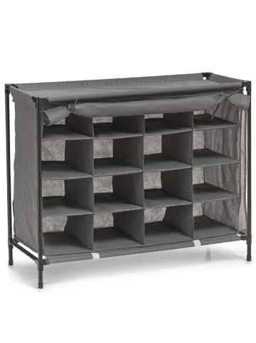 Ein praktischer Materialschrank zur Aufbewahrung von Schuhen. Es kann bis zu 16 Paare gleichzeitig aufnehmen. Ideal für die vorübergehende Aufbewahrung von Schuhen zu Hause, im Büro, im Sommerhaus oder auf dem Campingplatz. Es erlaubt Ihnen, den Raum auf eine Weise zu ordnen, weil es geräumig ist und nicht viel Platz beansprucht. Die Metallkonstruktion und vier Beine sorgen für eine stabile Einstellung. Von vorne wird das Material aufgerollt, wodurch Sie schnell zum Inhalt kommen. Leicht und kompakt. Es kann leicht an jeden Ort verschoben werden. Aus atmungsaktivem Material, das für freie Luftzirkulation sorgt. Produkteigenschaften:faltbare Textilgarderobe für Schuhe, ideal für Zuhause, Büro oder Reisen, ausgestattet mit 4 Ebenen, schützt den Inhalt vor Staub und Schmutz, hilft, die Schuhe an einem leicht zugänglichen Ort zu halten, atmungsaktives Material sorgt für freie Luftzirkulation, konzipiert für die Selbstmontage, stabile Metallkonstruktion, graue, neutrale Farbe, Markenprodukt der deutschen Firma ZELLER. Dieses Produkt darf sicher und in der vom Hersteller vorgesehenen Weise verwendet werden und ausschließlich gemäß den Anweisungen, Empfehlungen, Warnungen oder Sicherheitsinformationen, die auf dem Produkt oder seiner Verpackung angebracht oder beigefügt sind.
