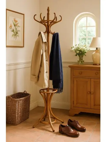 Eleganter Garderobenständer aus Massivholz – in 8 edlen Farben erhältlich.Bringen Sie stilvolle Ordnung in Ihr Zuhause mit diesem zeitlosen Garderobenständer aus massivem Birkenholz, der in acht attraktiven Farben erhältlich ist: Braun, Erle, Brombeere, Rot, Schwarz, Weiß, Natur und Mahagoni. So lässt sich das Modell perfekt an Ihre Einrichtung im Landhausstil, modern oder klassisch anpassen. Gefertigt aus hochwertigem Massivholz (Birke) und mit einem drehbaren Oberkranz (Ø 51 cm) ausgestattet, bietet der Garderobenständer 6 stabile Doppelkleiderhaken für Jacken, Taschen oder Hüte. Eine integrierte Schirmhalterung sorgt zusätzlich für praktischen Stauraum im Flur, Eingangsbereich oder Büro. Dank der stabilen Konstruktion mit einem Fußdurchmesser von 56 cm und einer Belastbarkeit von bis zu 20 kg ist dieser Kleiderständer nicht nur dekorativ, sondern auch äußerst funktional. Die Lieferung erfolgt zerlegt mit bebilderter Montageanleitung.Produktdetails im Überblick: Material: Massivholz Birke gebeizt & lackiert In 8 Farben wählbar: Braun, Erle, Brombeere, Rot, Schwarz, Weiß, Natur, Mahagoni Maße: Ø 56 cm x Höhe 184 cm Drehbarer Kranz: Ø 51 cm mit 6 Doppelhaken Zusatzfunktion: Regenschirmhalter Belastbarkeit: ca. 20 kg Lieferumfang: Zerlegt inkl. Aufbauanleitung (ohne Dekoration)Ob im modernen Eingangsbereich, im klassischen Flur oder im Büro mit Charakter – dieser hochwertige Garderobenständer sorgt für einen stilvollen ersten Eindruck und frischen Wind in Ihren Räumen. Jetzt entdecken und stilvoll Ordnung schaffen!- Kultiger Garderobenständer aus massivem Birkenholz – hochwertig verarbeitet- Drehbarer Oberkranz mit Ø 51 cm und 6 Doppelhaken für Jacken, Hüte & Accessoires- Integrierte Regenschirm-, Stockhalterung – praktische Zusatzfunktion- Maße: ca. Ø 56 x H. 184 cm – ideal für Flur, Diele, Büro oder Empfang- In 8 Farben wählbar – stilvolle Optik für jeden Eingangsbereich