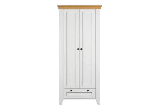 OTTO home – Idyllisch, gemütlich, maritim, rustikal: Der Landhausstil. Mit der natürlichen Schönheit der massiven Kiefer. Zwei Drehtüren in dekorativer Kassettenoptik. Mit einer Kleiderstange, einem Schubkasten und drei Schienen in jedem Schrankseitenteil für Aufhängemöglichkeiten von Kleidung oder zum Abstellen von Hausschuhen an der Seite. Beeindruckende Optik durch spezielle Fußform und fein gefräste Kranzleiste