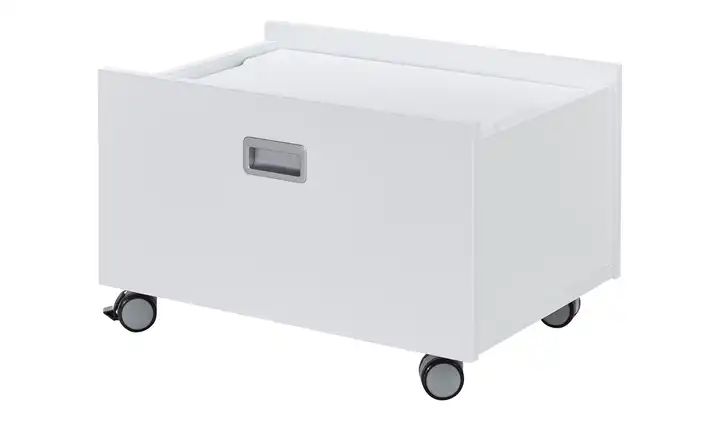 Die Rollbox Fiona ist eine passende Ergänzung zum Kojenbett der Kinderzimmerserie Fiona. Sie bietet Ihnen Stauraum und kann platzsparend unter das Bett geschoben werden. Durch die vier Rollen geht das ganz einfach. Die Rollen sind für alle Bodenbeläge geeignet. Zwei der vier Rollen lassen sich bei Bedarf feststellen. Mittig ist an der Front ein silberfarbener Muldengriff angebracht, durch den Sie die Box leichter hervorziehen können. Durch die Abdeckung ist der Inhalt der Box vor Staub geschützt. Wie alle Artikel der Serie Fiona, ist auch die Box in Kreideweiß gehalten und passt auch optisch zu den anderen Möbeln.