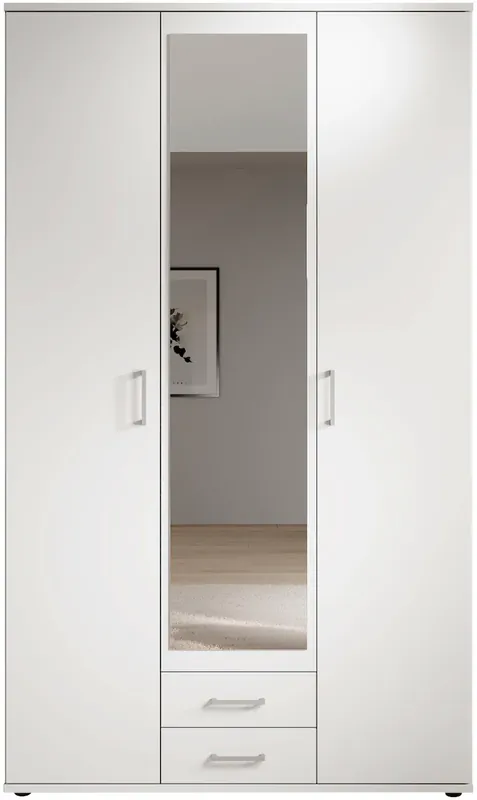 Dieser attraktive Kleiderschrank inklusive Spiegelelement auf der Mitteltür repräsentiert einen zeitlosen Einrichtungsstil. Als Stauraummöbel ist er eine sinnvolle Ergänzung für das Schlafzimmer. Der Innenbereich ist funktional aufgegliedert, um Kleidung an den Metallstangen aufzuhängen oder in den verschiedenen Fächern abzulegen. Die Schubladen bieten sich für kleinere Accessoires an. Ausgestattet ist der Schrank mit silberfarbenen Kunststoffgriffen. Die Türscharniere sowie die Laufleisten der Schubladenelemente bestehen aus Metall.